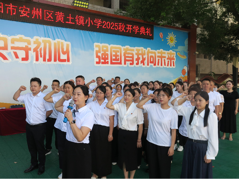 这天,阳光明媚,秋高气爽。该校教学楼上LED显示屏上,“新学期,新观念,新起点,新佳绩”几个大字格外醒目。上午八点半,开学典礼在雄壮的国歌声和庄严的升旗仪式中正式开始。黄土镇小学党支部书记,校长黄雪梅致辞,她回顾了学校一年里取得的优异成绩,并结合抗战胜利八十周年的历史意义,对全校师生提出了殷切希望,她希望全校孩子们在抗战精神的鼓舞下,好好学习,天天向上,将来为祖国强国建设贡献自己的力量。教师代表董玲在发言中,表达了作为新时代的教师,应努力工作,教书育人,为人师表,用抗战精神勉励孩子不管在学习中,还是在自己的人生历程中,都要奋力前行。学生代表葛雨涵在发言中表示要在老师的教导下,勤奋学习,勤练本领,为学校增光,报效祖国。然后,黄雪梅带领全体教师下,进行了庄严的师德宣誓。