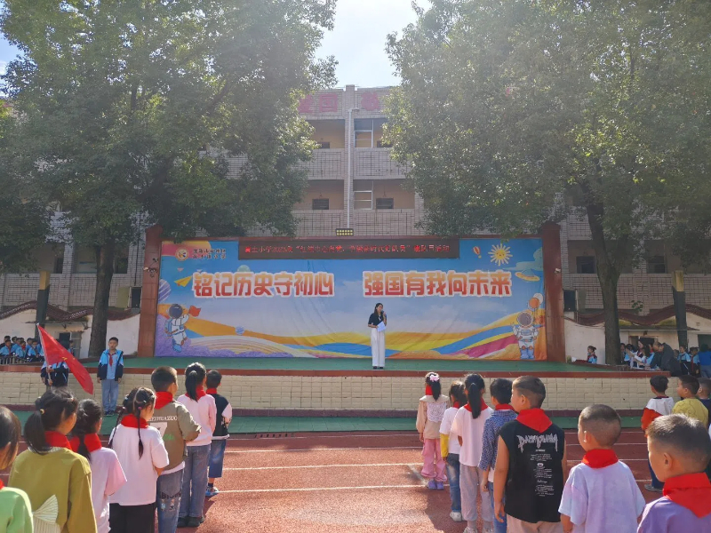 10月13日,金秋送爽、丹桂飘香,天气晴朗。上午10时许,2025秋“红领巾心向党,争做新时代好队员”少先队建队日活动拉开序幕。在雄壮的进行曲中,两名护旗手分开左右,五二中队旗手陈雨辰紧握队旗,缓步进入会场,所以少先队员举起右手,行着庄严的队礼,见证这一辉煌时刻。接着,在卓婉婷的指挥下,全体师生唱起了雄壮的《中国少年先锋队队歌》。新当选的少先队大队部大队长李思潼宣布新队员名单,由五六年级老队员为新队员佩戴鲜艳的红领巾。新队员个个异常激动,双手抚着鲜艳的红领巾,脸上洋溢着幸福的笑容。新老队员举起右拳,在李思潼的带领下,在鲜艳的队旗下,进行了庄严的宣誓。学校党支部书记、校长黄雪梅在讲话中勉励新老队员要做爱国有情怀的好少年, 做勤奋学习的好少年,做品德优良的好少年,做体魄强健的好少年,做热爱劳动的好少年,并祝愿孩子们在星星火炬旗帜的指引下茁壮成长!由五二中队带来的节目《时刻准备着》,诠释了做新时代好队员的铿锵誓言。建队日活动在激昂雄壮的呼号声中圆满结束。